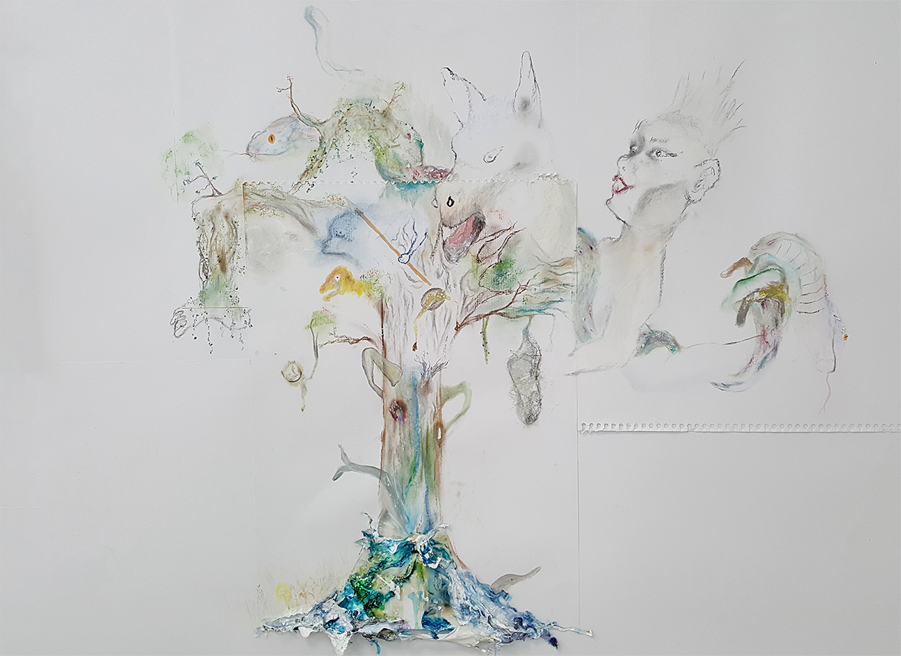 Wood, log, cement, modelingpaste, steel wire, styrofoam, can, branch, waste bag, bulb, battery, power switch and film
